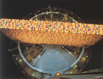 aus 13.000 leeren, bunten Fässern. Diese Ausstellung erzielte